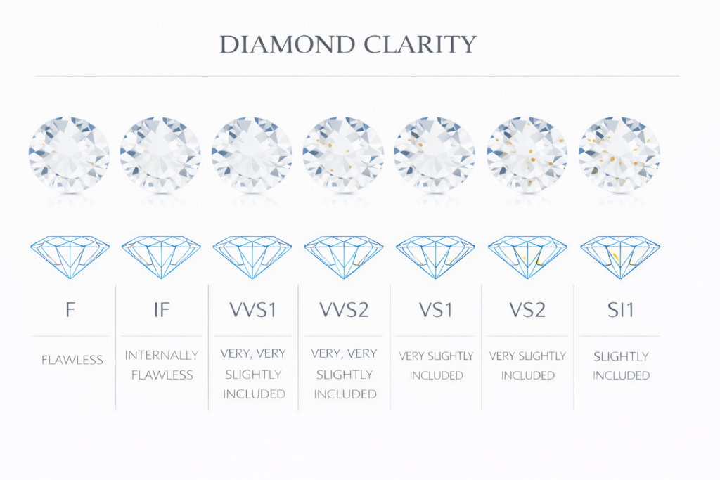 Understanding diamond clarity helps you choose a stone that looks beautiful in real life — without paying for characteristics you’ll never see.